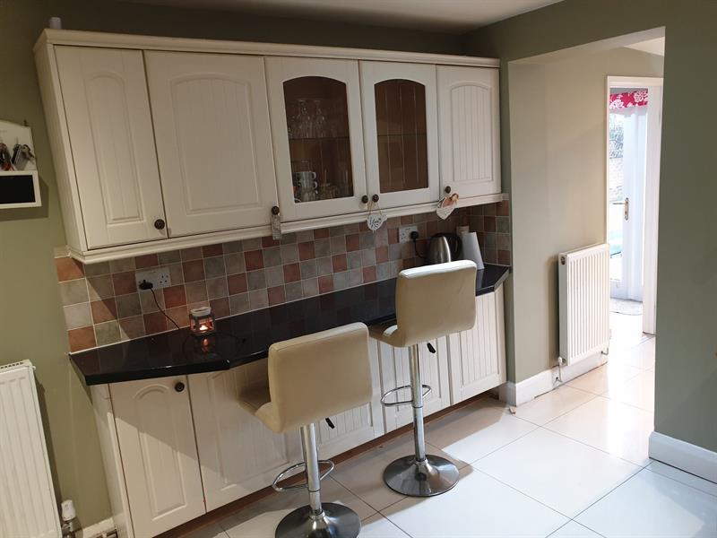 The kitchen has a built-in breakfast bar and benefits from ample storage and cupboard space.